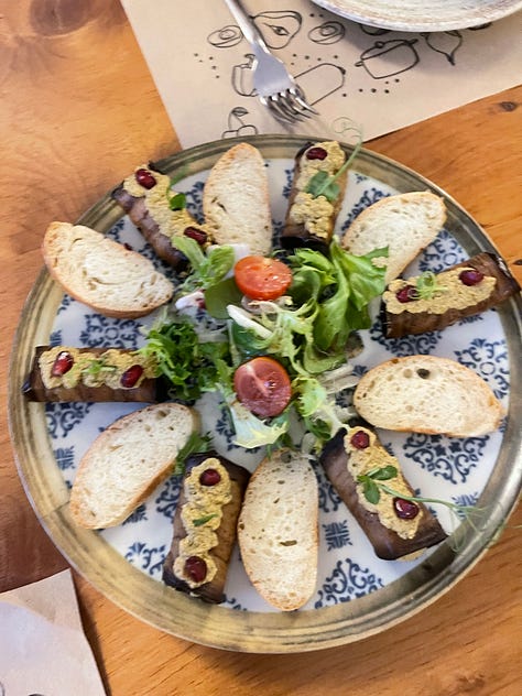 The historic Black Sea port city Batumi, which itself is over 2,000 years old, is the namesake of a wonderful restaurant in Valencia, with two locations, in Mestalla and Ruzafa. At the location in Ruzafa, there is a nice, welcoming vibe, with service that is both friendly and professional. Three of us, two New Yorkers and an Eastern European, were welcomed with an amuse-bouche, a tiny toast dolloped with pate and garnished with a single pomegranate aril (seed).