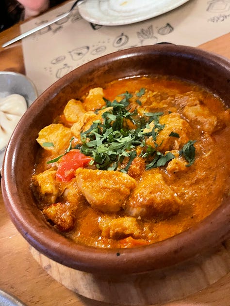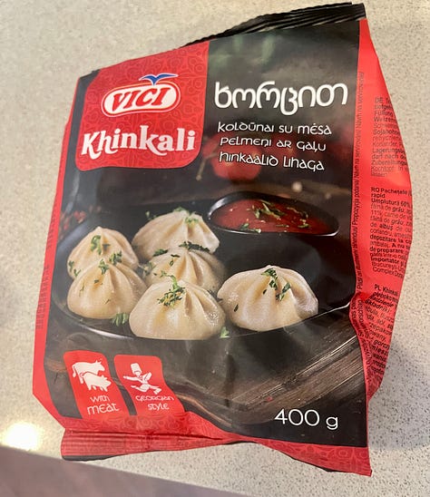 We also ordered two types of Khinkali, one stuffed with cheese, the other with veal. These are large dumplings, with the tops twisted into a knot. They are accompanied by a dipping sauce, and you eat them with your hands, grabbing them by the “knot”. You also need to “bite and suck”, as they are filled with broth, similar to a Chinese xiaolongbao, or soup dumpling. Speaking of which, all of this food can be eaten with your hands, which, for some reason, makes everything taste better.