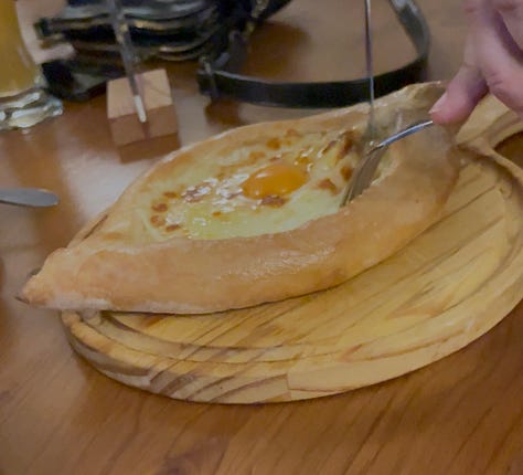Khachapuri, Georgian fresh bread stuffed with egg and cheese Adjarski-style; served with Odjakhuri roast pork, tomatoes, potatoes, and onions in a clay pot; and Khinkali, cheese or meat dumplings