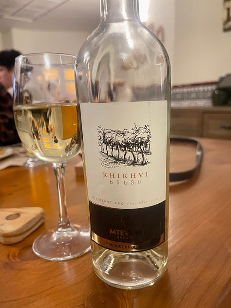 We also ordered two types of Khinkali, one stuffed with cheese, the other with veal. These are large dumplings, with the tops twisted into a knot. They are accompanied by a dipping sauce, and you eat them with your hands, grabbing them by the “knot”. You also need to “bite and suck”, as they are filled with broth, similar to a Chinese xiaolongbao, or soup dumpling. Speaking of which, all of this food can be eaten with your hands, which, for some reason, makes everything taste better.